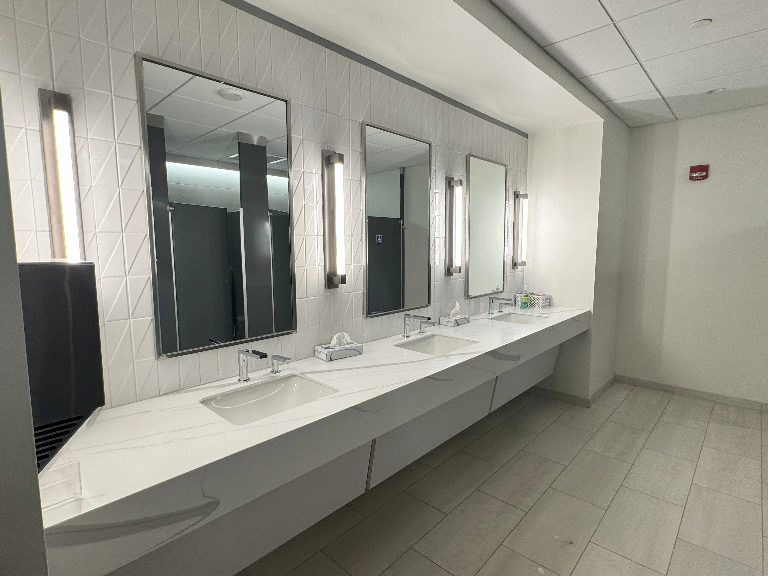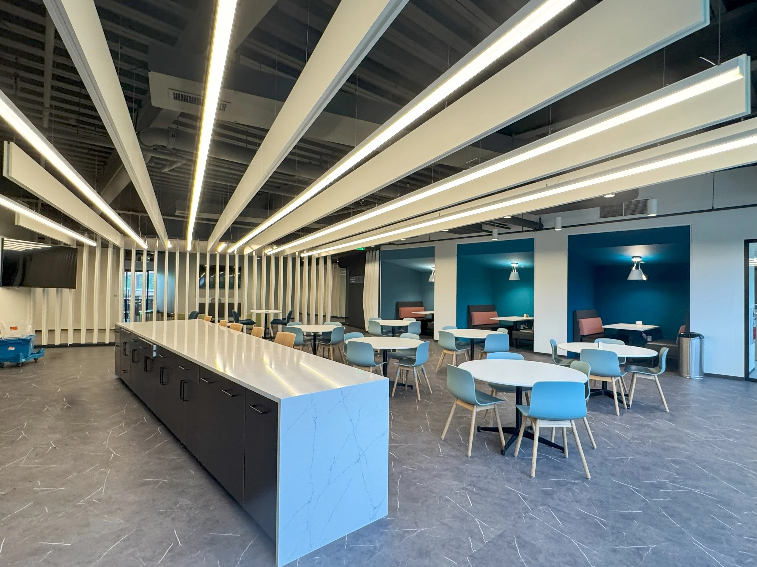 Our team designed integrated MEP/FP solutions that leveraged the building’s existing infrastructure while providing modern upgrades to support technology-focused operations. Highlights of the scope included new heat pumps selected from the landlord’s inventory, supplemental cooling for critical IT spaces, updated branch circuiting for new power and lighting needs, upgraded sprinkler layouts to meet code, and revised plumbing connections for the café and wellness areas.